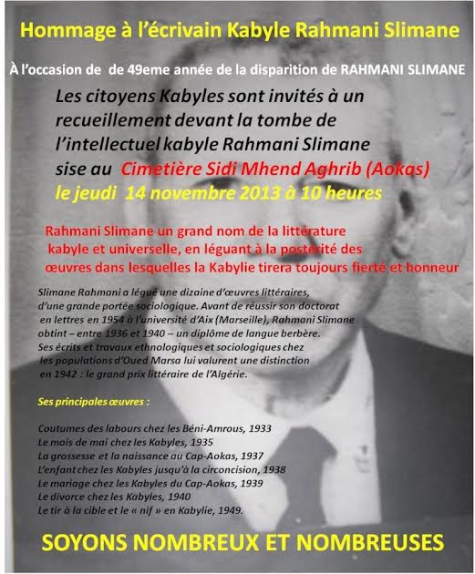 A l’occasion de la 49e année de sa disparition, les citoyens et citoyennes amazighs sont invités à un recueillement devant la tombe de l’intellectuel amazigh Rahmani Slimane, au cimetière Sidi M’hend à Aokas, (Bejaïa, Algérie) le jeudi 14 novembre 2013 à 10 heures. Soyons nombreux et nombreuses.