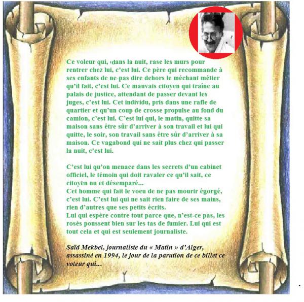 le journaliste qui n'a jamais volé mais qui est pourchassé et menacé tel un voleur , celui auquel on confectionne un simulacre de procés pour le jeter en prison, celui que l'on guette au bas de l'immeuble , dans sa voiture en stationnement ou dans un restaurant de quartier, celui que l'on veut faire taire pour de bon et par tous les moyens , celui qui est frappé d'anathème et de malédiction jusquà commanditer sa mort ou lui refuser l'inhumation en sa terre natale , cet éveilleur de conscience qui n'a que ses écrits pour diffuser sa lumière, sa vérité.