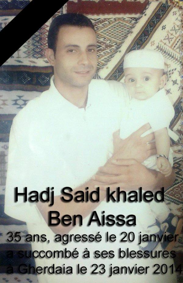 Le 19 janvier 2014, à Ghardaïa, Hadj Said khaled Ben Aissa, 35 ans, père de deux enfants a été lynché par des Baltaguia à la solde de la régence d’Alger. Laissé à terre dans un état d’inconscience, Hadj Said khaled n’échappe pas à la hargne de policiers qui achèvent la sale besogne de leurs supplétifs : la mise à mort d’un homme qui a pour seul tort d’être mozabite. La scène, en témoigne la vidéo prise à partir d’une terrasse, ne laisse pas de place au doute sur la gravité des faits. Les policiers, censés être au service de la loi républicaine, ont non seulement agressé un homme qui était à terre blessé et inanimé, ils ont aussi empêché d’autres citoyens de lui apporter secours et aide.