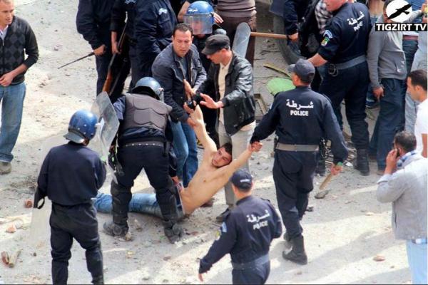 Dernière agression grave : elle a eu lieu le 20 avril 2014 à Tizi Ouzou, en plein célébration du printemps amazigh. Comme le montre la photo, elle l’oeuvre de policiers zélés.