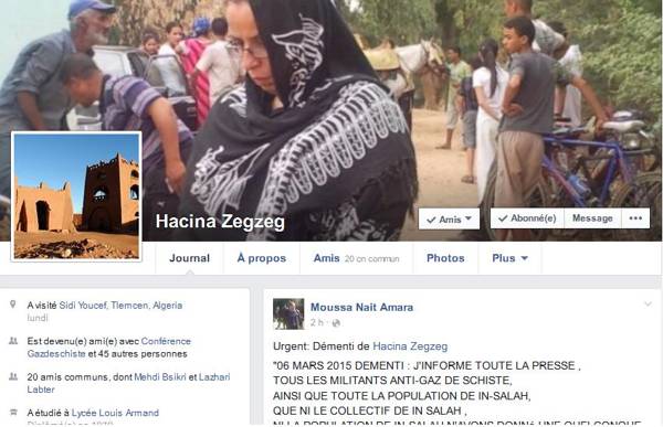 Un mail n’émanant pas de la militante Hacina Zegzag et citant son nom et ses coordonnées téléphoniques a été adressé à des journalistes et à des titres de presse. Ce feak viserait à compromettre cette animatrice du mouvement de contestation populaire qui se développe à In Salah depuis début du mois janvier. Ce courriel tendancieux tend à l’incriminer par des commentaires sur les dernières évolutions de la situation, notamment les discussions qui ont eu lieu entre les représentants de la société civile et le commandement de la 6e région militaire.