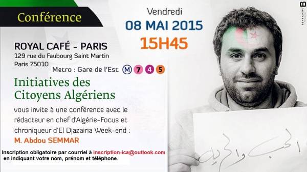 Une conférence débat avec Abdou Semmar, journaliste d’investigation, rédacteur en chef d’Algérie-Focus et ex-chroniqueur d’El Djazairia Week-end aura lieu le 8 mai à 15h30 au Royal Est, à Paris.