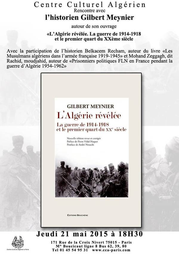 L’historien Gilbert Meynier est l’invité du CCA jeudi 21 mai pour parler de son livre « L’Algérie révélée, la guerre de 1914-1918 ». Seront aussi présent Belkacem Recham auteur de « Les musulmans algériens dans l’armée française 1919-1945 » et Mohand Zeggagh, moudjahid auteur de « Prisonniers politiques algériens du FLN en France pendant la guerre d’Algérie 1954-1962 ».