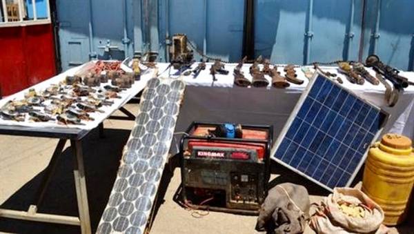 « Un lance-roquette de type (RPG7), deux canons de fusils semi-automatiques, six obus RPG7, huit charges d’obus, 38 téléphones portables prêts à exploser, 13 bombes de confection artisanales, quatre paires de jumelles, une importante quantité de munitions de différents calibres, 24 kilogrammes de TNT, 12,5 kilogrammes d’explosifs, 170 litres d’acide nitrique, 31 détonateurs, six mètres de mèche de détonation, un groupe électrogène, deux panneaux solaires, des vêtements, des denrées alimentaires et autres objets », ont également été découverts, ajoute le communiqué.