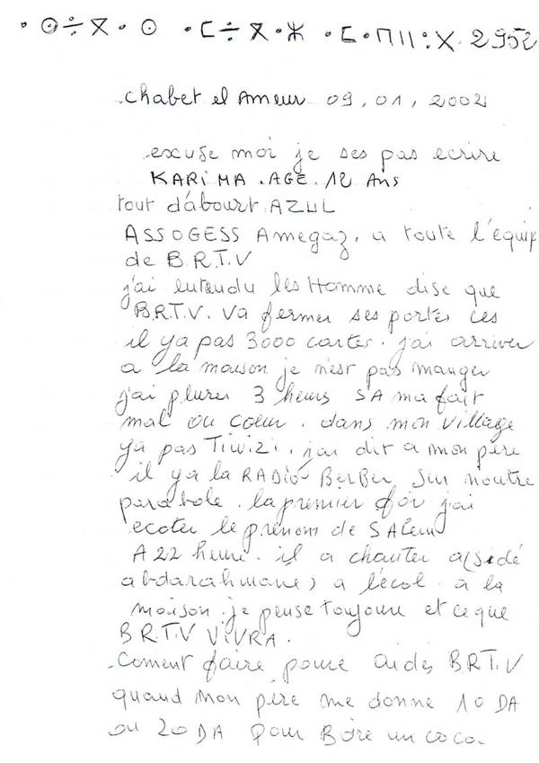 Mohamed Sadi: Tout projet génère ses difficultés selon sa nature. L’important est de faire preuve de persévérance. Il n’est pas nécessaire que je m’étale aujourd’hui sur ce sujet. Un jour peut-être nous écrirons l’histoire de cette longue épopée qui a commencé avec une caméra et qui a abouti à une chaîne en plein développement. Les difficultés sont nombreuses et souvent durement surmontables mais, les attentes de notre public et ses encouragements nous ont armés d’une volonté et d’une foi à toute épreuve. A ce propos, je me rappelle d’une période assez cruciale où nous avions failli fermer l’antenne à cause d’un piratage massif qui a lourdement pesé sur nos moyens, c’était en 2002. J’ai été surpris par l’ampleur de la solidarité qui s’est exprimé tant dans l’immigration qu’en Kabylie. Une jeune fille de 12 ans m’avait écrit une lettre (*) qui résume le sentiment général de cette grande mobilisation, elle est si émouvante qu’elle m’a mis devant la responsabilité de déployer des efforts parfois surhumains pour maintenir à ce jour le flux régulier de la chaîne. Cette lettre vaut pour moi et je l’espère aussi pour tous, un motif suffisant pour aller à l’assaut du ciel s’il le faut pour la cause amazighe. Elle inspire un seul mot d’ordre: ne jamais renoncer!