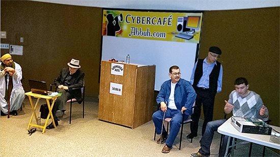Au Cybercafé se trouve, en plus de Hadj Alemmas, l’instituteur du village, l’étudiant Menad, venu pour réparer un ordinateur au propriétaire du Cybercafé Dda Yidir, mais aussi Laqasma (joué par Brahim Benammar dont le rôle a changé depuis l’imam dans la pièce Ass unejma), un retraité de la mouhafadha du FLN, le parti unique qui a géré le pays après le départ du colon français.