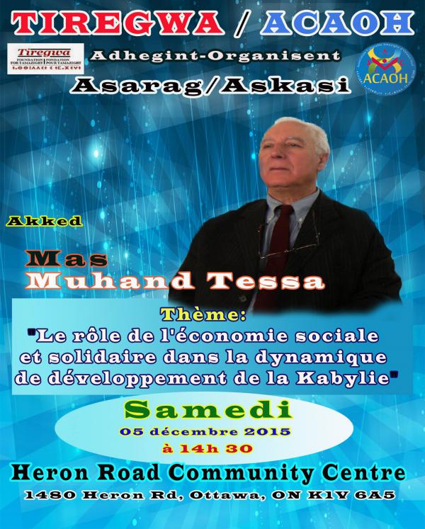 Dans le cadre des conférences qu’organisent périodiquement l’Association ACAOH et la Fondation Tiregwa, toutes deux basées dans la région de la capitale nationale canadienne, M. Mohand Tessa donnera une conférence sur "Le rôle de l'économie sociale et solidaire dans la dynamique de développement de la Kabylie". La conférence aura lieu le Samedi 05 décembre 2015 à 14h30 au Heron Communauty Centre, sis 1480 Heron Road, Ottawa.