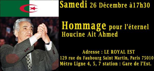 Des Algériens, militants associatifs, appellent toutes celles et tous ceux qui souhaitent témoigner et rendre hommage à Hocine Aït Ahmed à venir les rejoindre samedi à 17h30, au Royal Est Faubourg Saint Martin, à Paris.
