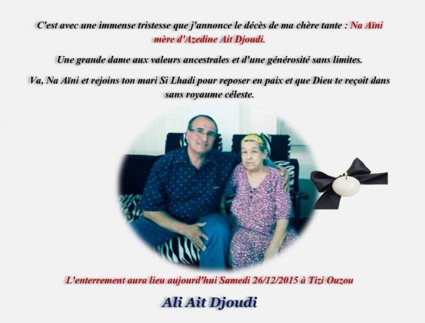 Suite au décès de Aïni Aït Djoudi, mère de Azzedine, je présente, en cette triste circonstance à Azzedine mes plus sincères condoléances.