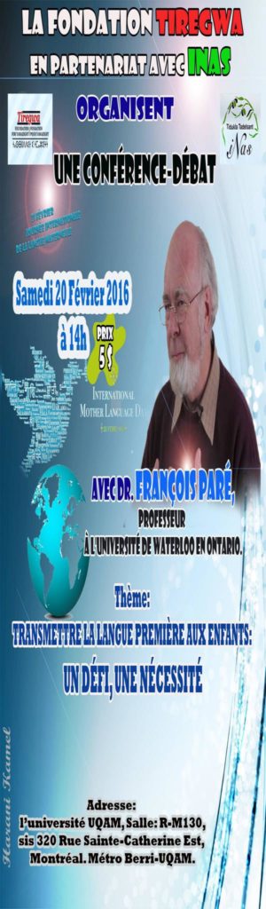 C’est dans ce cadre que Tiregwa, la fondation canadienne pour tamazight, et en partenariat avec l’association INAS de Montréal et l’Association ACAOH d’Ottawa, ont invité le professeur canadien François Paré pour animer deux conférences-débats sur la nécessité de transmettre la langue première aux enfants en général et aux enfants canadiens (issus de l’immigration) en particulier.