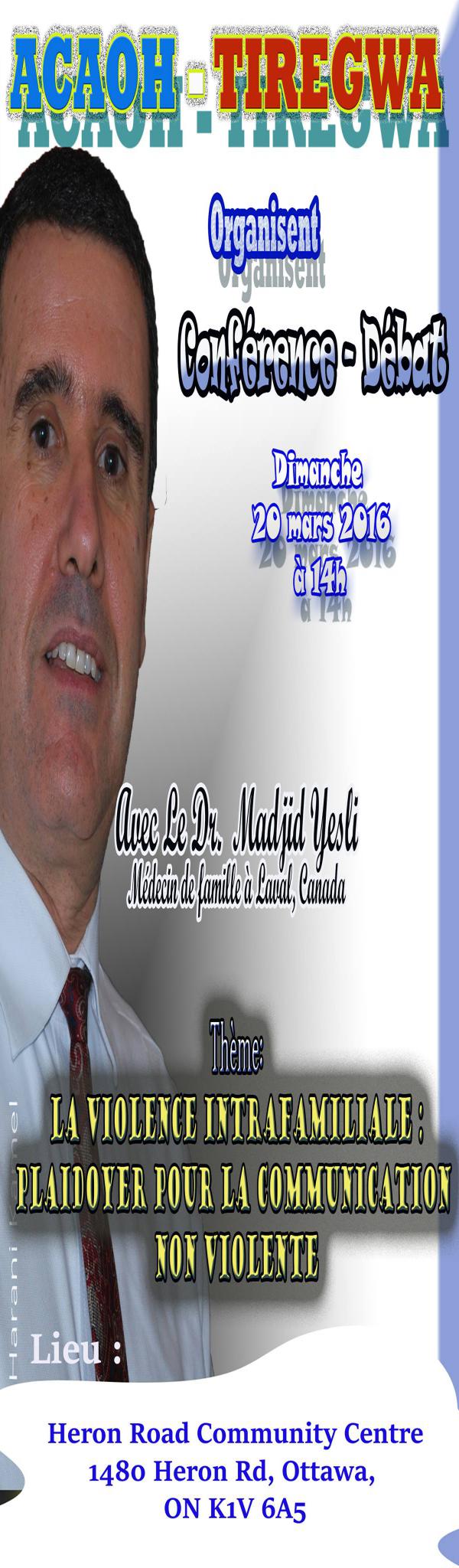 La fondation Tiregwa organise deux conférences avec Dr. Madjid Yesli, médecin de famille à Laval sur le thème de la violence intrafamiliale les journées du Samedi 19 mars à Montréal et Dimanche 20 mars à Ottawa en partenariat avec l’Association ACAOH.