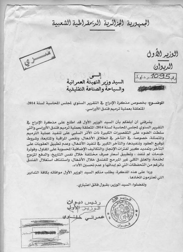 Passons sur les affirmations comminatoires, sans preuves, et intéressons-nous aux seuls documents sur lesquels toute cette histoire a été tissée. Autrement dit une mystérieuse directive « ultra secrète » (***) envoyée récemment par le très intègre Premier ministre Abdelmalek Sellal via Amrani Hafnaoui, son chef de cabinet .