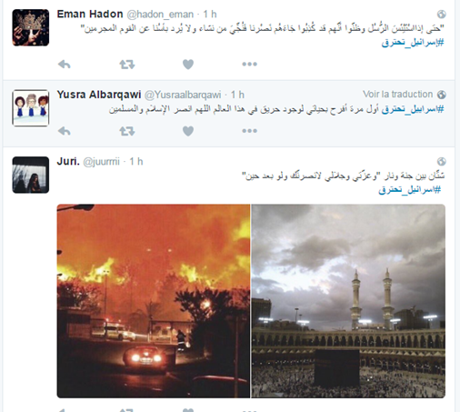 Sur les principaux réseaux sociaux qu’utilisent les populations arabes, la jubilation était le maître-mot. Sur Tweeter, le hashtag #اسرائيل_تحترق (Israël brûle), fait fureur. Des utilisateurs qui ne cachent pas leur joie de voir l’État « sioniste » brûler, voient un signe de mécontentement divin. Rien que ça ! « Aucun doute, c’est un châtiment divin », jubilait Muhammad. »Personne n’a réussi à dormir de joie, Dieu merci ! », surenchérit Yocef. « Plutôt dans cette vie avant les enfers », répondait honteusement Anissajali.