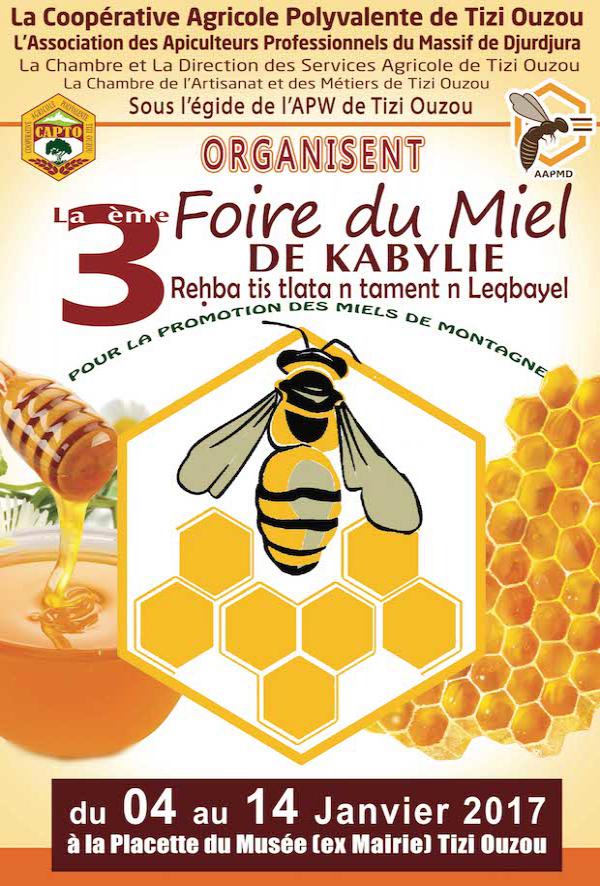 L’association des Apiculteurs professionnels du massif de Djurdjura que préside Salem Touati et la coopérative CAPTO – Tizi-Ouzou en partenariat avec la DSA (direction des services Agricoles) et la chambre de l’agriculture de wilaya de Tizi-Ouzou organisent une foire au miel et des produits de la ruche au centre-ville de Tizi-Ouzou (placette du musée) et ce du 04 au 14 janvier 2017.