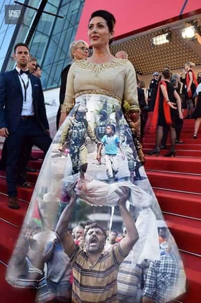 Sur la Croisette, la guerre isaélo-palestinienne se poursuit autrement. Par l’image et les symboles. La ministre israélienne n’est pas passée inaperçue devant les milliers de photographes, des médias et notamment des festivaliers qui sont plus nombreux cette année. Une polémique sans précédent qui enflamme les réseaux sociaux. Un acte qui survient en plein festival pendant la montée des marches et au moment où le conflit continue entre la Palestine et Israël. La ministre politise le festival et entendait par cette robe célébrer « les 50 ans de la libération et de la réunification de Jérusalem ». Quand on sait la symbolique que représente cette ville, il n’y a lieu de douter que la ministre entendait créer un clash. Des internautes pro-palestiniens ont détourné la robe de la ministre l’illustrant de victimes des bombardements (voir plus bas).