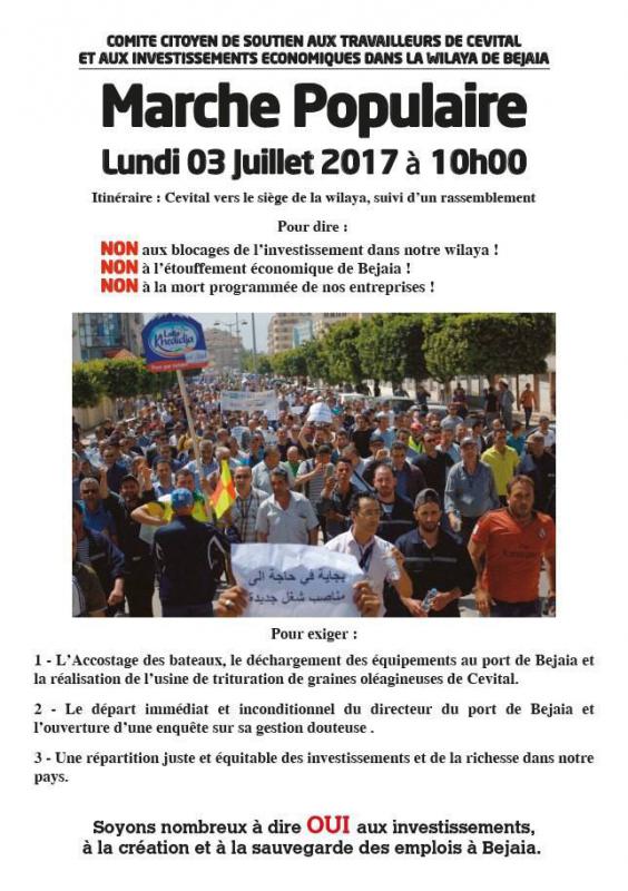 Un appel à une marche populaire pour lundi matin est lancé à la population de Bejaia. Le comité de soutien exige désormais « le départ immédiat et inconditionnel du directeur du port de Béjaïa et l’ouverture d’une enquête sur sa gestion douteuse » et « une répartition juste et équitable des investissements et de la richesse dans notre pays » dans son communiqué. Etrangement le directeur du port de Bejaia a décidé d’autorité le déchargement de deux bateaux du groupe Cevital destiné à fournir la nouvelle unité de trituration des graines oléagineuses.