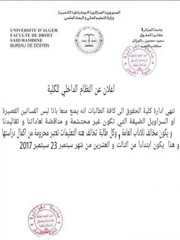 Il y a un mois, presque jour pour jour, une note similaire, affichée à la faculté de Droit, de l’université d’Alger 1, avait créé la polémique parcequ’elle interdisait aux étudiantes de « porter des jupes et des pantalons serrés qui ne sont pas décents, et qui vont à l’encontre de nos traditions et mœurs ».