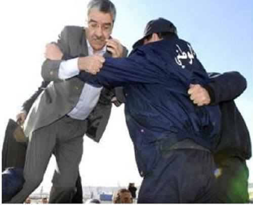 Puis j’assiste à quelque chose d’inimaginable. En moins de quinze minutes tout bascule. Le cordon de policiers qui fermait la place s’ouvre et laisse passer une cinquantaine, peut-être un peu plus, de beltadjias pour aller à la rencontre de Said Sadi. Aussitôt le cordon se referme emprisonnant les marcheurs qui voulaient sortir de la souricière. Said Sadi encerclé par la police est poussé devant les beltadjias avec la dizaine de militants qui l’avaient rejoint. Insultes et projectiles divers pleuvent. D’autres agents anti émeutes arrivent et délimitent une arène dans laquelle les beltadjias frappent et hurlent sous la bienveillante attention des CNS. Pris dans le groupe, j’ai personnellement été insulté et agressé de coups de pieds malgré mon appareil que je tenais bien en vue. Deux jeunes tiraient sur la lanière. En voulant protéger mon appareil j’ai reçu un coup aux parties et j’ai tout lâché. J’ai entendu ce que Said Sadi a dénoncé : « sale Kabyle, juif, va chez toi et d’autres grossièretés… » pendant que ses militants, formant autour de lui un bouclier humain, essaient de reculer vers la voiture. J’ai remarqué aussi des armes blanches qui circulaient et j’ai aussi vu le coup de couteau qui a visé Said Sadi. Il a été amorti par le bras d’un militant habillé d’une parka marron avant de finir sa course sur la main gauche du président du RCD qui protégeait son visage.