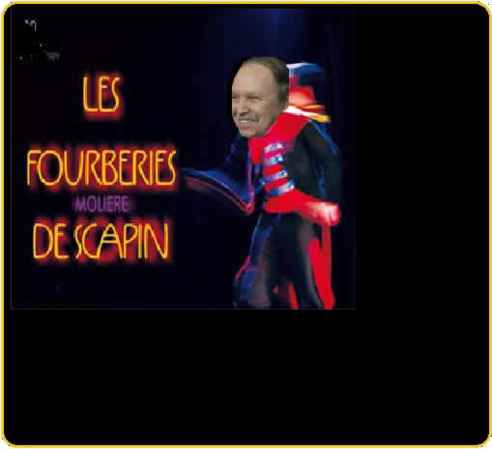 "Les fourberies de Scapin " pour flouer son monde et donner l'impression de reformer l'irréformable, une façon de gagner du temps et des reliquats pour que les gens attendent ce qu'ils ont attendu depuis onze années et qui n'est jamais venu. Ce qu'il faut craindre par contre c'est qu'ils nous invente une autre calamité , un autre fléau aprés ceux qu'on a déjà vécus sous la gouverne de leurs tâtonnements et leur iktina3 infini. Aprés 11 années de règne sans partage et le retentissement des révolutions qui ont lieu dans les pays arabes notre Scapin s'est décidé enfin à bouger pour nous risquer dans son train de reformes condensées qui va plus vite que la lumière et qui a toutes les chances de nous faire reculer un peu plus dans le temps tel que nous le connaissons.Les fanfaronnades diplomatiques en cul de poule n'y pourront rien: Ma yenfa3 ghir Essah .