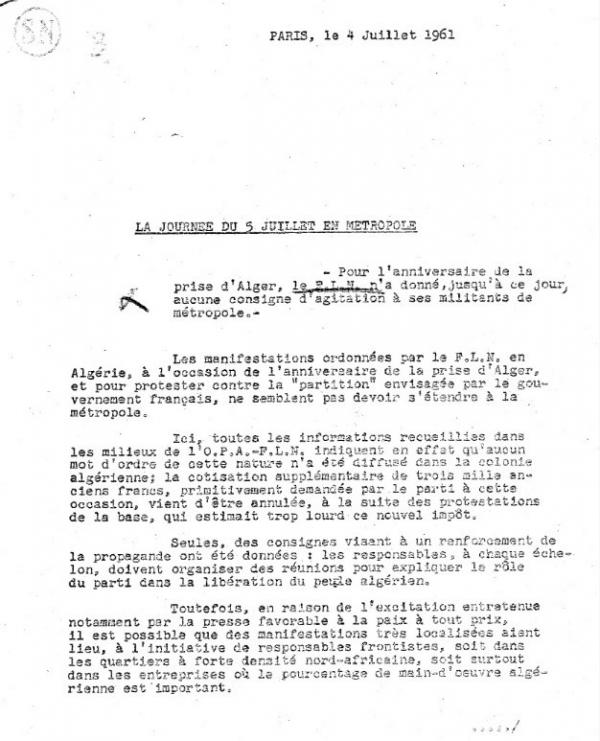 La Sûreté nationale soupèse, dans cette note du 4 juillet 1961, les risques d’une possible extension en métropole des manifestations en faveur de l’indépendance qui doivent être organisées le lendemain en Algérie par le FLN, à l’occasion de l’anniversaire de la prise d’Alger par les troupes françaises, le 5 juillet 1830.