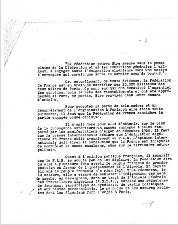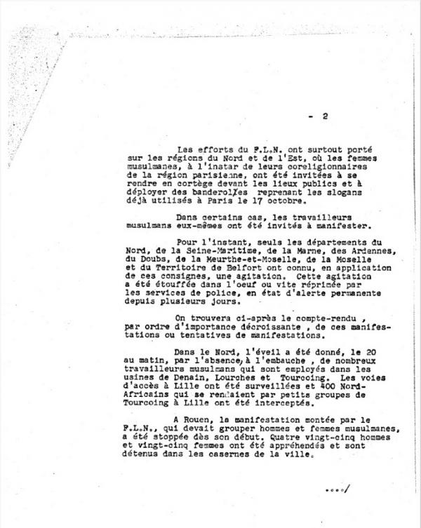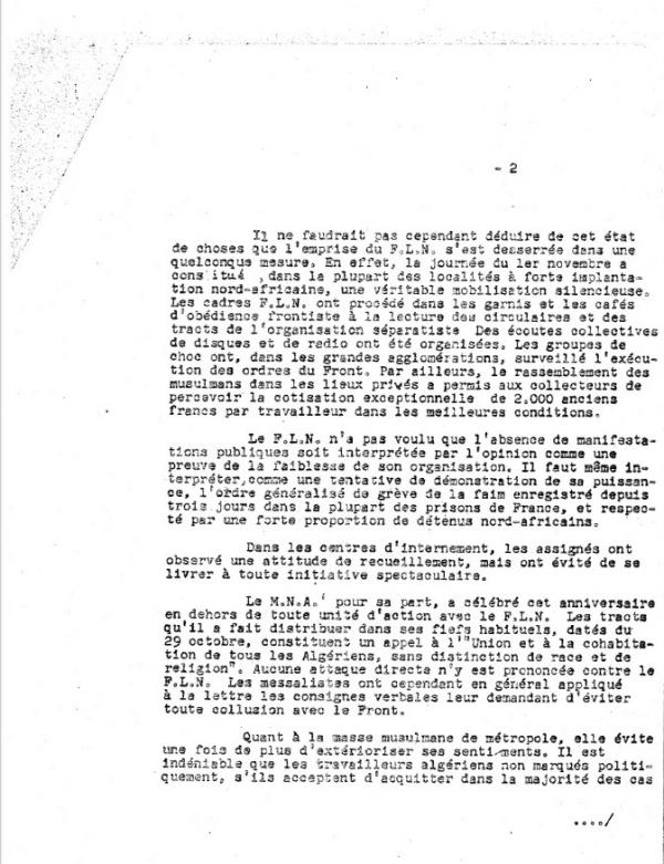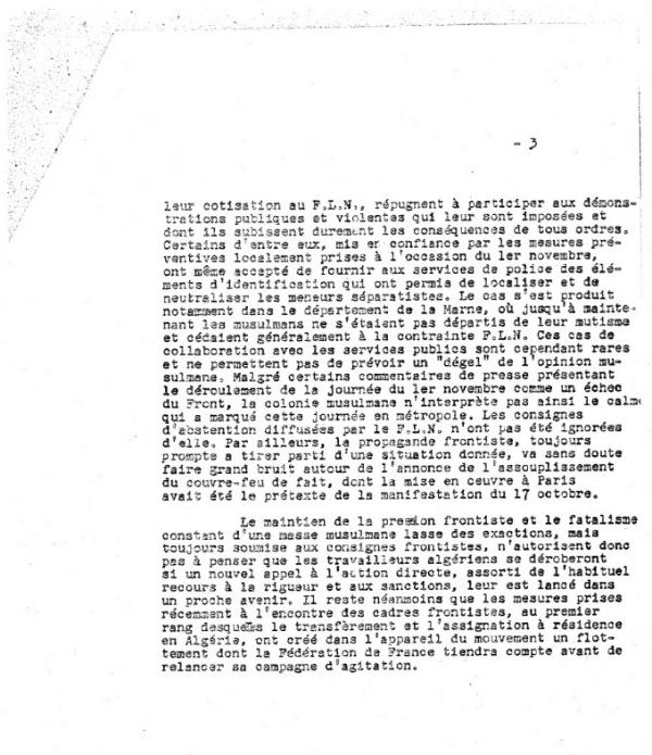 Une semaine après les manifestations du 17 octobre 1961, la Sûreté nationale évalue le degré de mobilisation de la « masse musulmane algérienne de métropole ». Les policiers craignent de nouvelles démonstrations de force du FLN, qui impose « une discipline de fer » aux immigrés algériens, et pour « montrer, quel que soit le prix de la démonstration, que le « peuple algérien » est un peuple libre et que le FLN est son meilleur représentant ».
