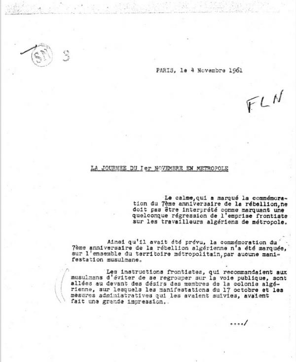 « Le calme qui a marqué la commémoration du 7e anniversaire de la rébellion ne doit pas être interprété comme marquant une quelconque régression de l’empreinte frontiste sur les travailleurs algériens de métropole« , prévient la Sûreté nationale dans une note du 4 novembre 1961.