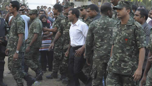 Un membre de l’opposition et une source diplomatique indienne à Colombo ont indiqué que Nasheed avait réclamé l’aide de l’Inde et que celle-ci lui avait été refusée. Un porte-parole du ministère indien des Affaires étrangères a indiqué que la rébellion était un problème interne et qu’il devait « être résolu par les Maldives« . En 1988, l’Inde avait dépêché sur place à bataillon pour déjouer une tentative de coup d’Etat et soutenir le gouvernement. Le nouveau chef de l’Etat a précisé à Reuters que Nasheed se trouvait sous protection de la police et que parler de coup d’Etat était « de la désinformation ».