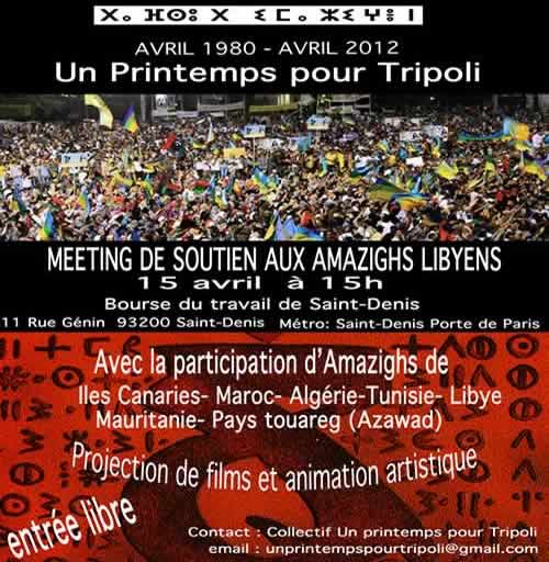 Le collectif un Printemps pour Tripoli organise un meeting de soutien aux Amazighs libyens dimanche à la Bourse du travail de Saint-Denis à 15h.