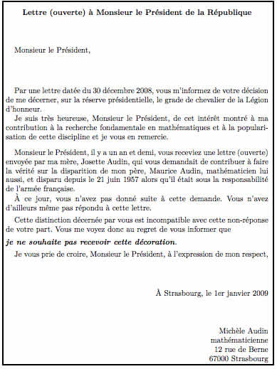 La lettre de Michèle Audin à Nicolas Sarkozy