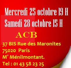 Le mercredi 25 octobre à 19 h et samedi 28 octobre à 15h. Adresse : 37 bis rue des Maronites 75020 Métro Ménilmontant. Tél. : 01 43 58 23 25.